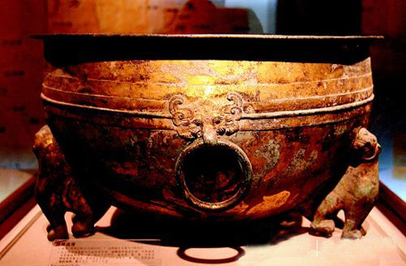 温酒樽如一对孪生兄弟,酒樽器盖口沿上都刻有铭文:“中陵胡傅铜温酒樽,重廿四斤,河平三年造。”它们通体鎏金,满饰虎、羊、牛、猴等动物,还有传说中的九尾狐。而酒樽亦通体鎏金,体型硕大,外壁彩绘有骆驼等动物形象。樽上所铸图案不像是中原风格——此种胡汉风格融于一器的精美文物在全国范围内亦属罕见。